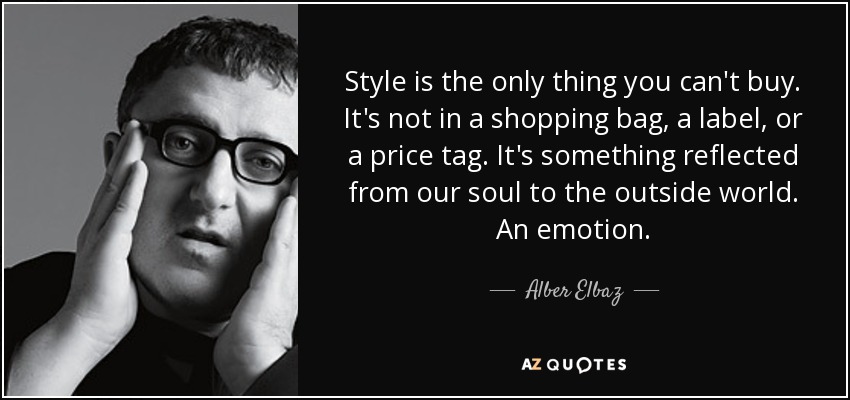 Style is the only thing you can't buy. It's not in a shopping bag, a label, or a price tag. It's something reflected from our soul to the outside world. An emotion.
