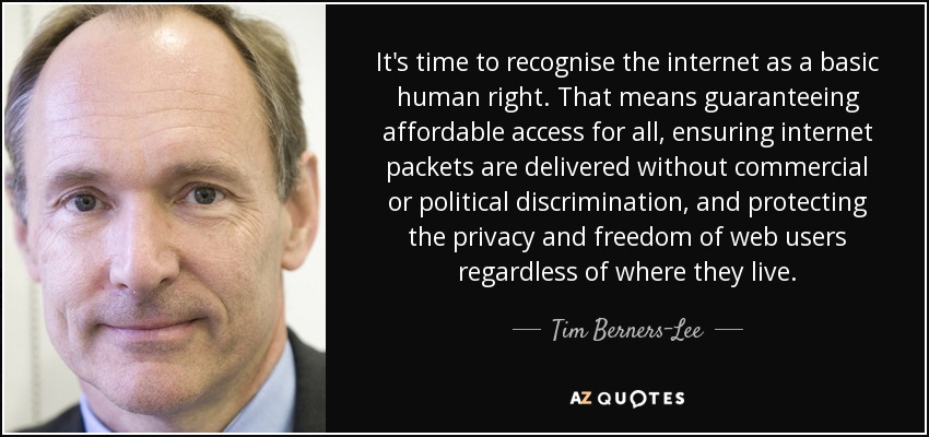 It's time to recognise the internet as a basic human right. That means guaranteeing affordable access for all, ensuring internet packets are delivered without commercial or political discrimination, and protecting the privacy and freedom of web users regardless of where they live.