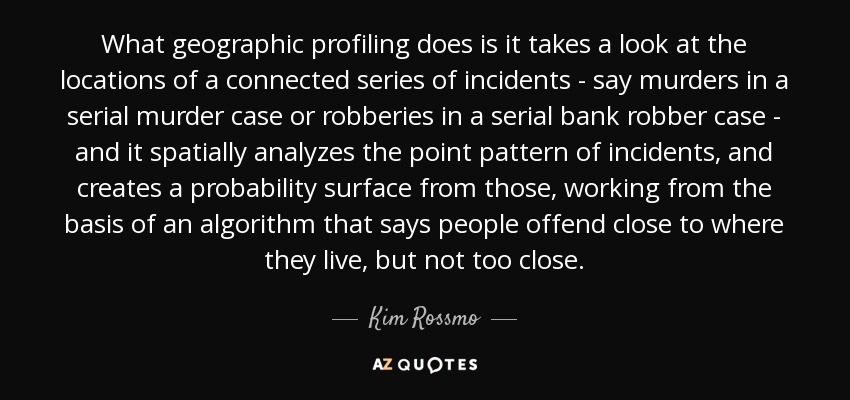 What geographic profiling does is it takes a look at the locations of a connected series of incidents - say murders in a serial murder case or robberies in a serial bank robber case - and it spatially analyzes the point pattern of incidents, and creates a probability surface from those, working from the basis of an algorithm that says people offend close to where they live, but not too close.