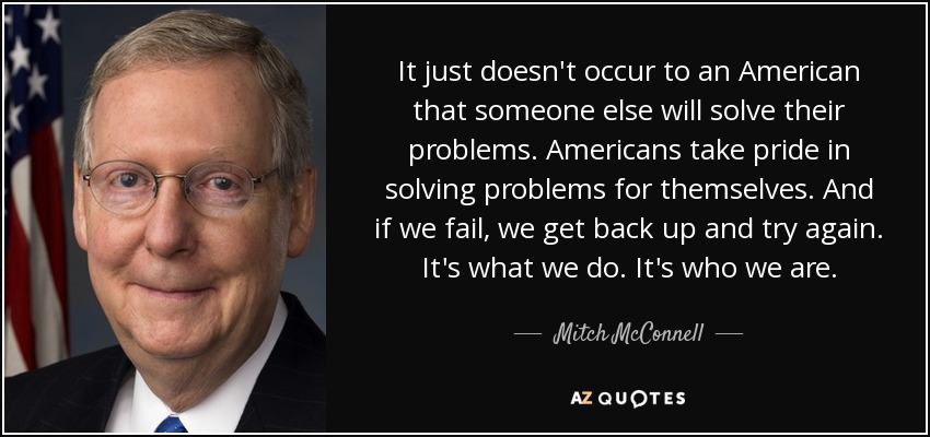 It just doesn't occur to an American that someone else will solve their problems. Americans take pride in solving problems for themselves. And if we fail, we get back up and try again. It's what we do. It's who we are.