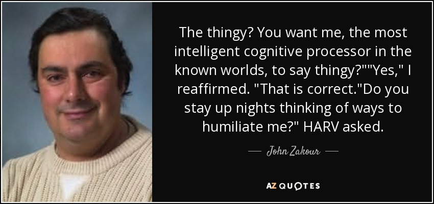 The thingy? You want me, the most intelligent cognitive processor in the known worlds, to say thingy?""Yes," I reaffirmed. "That is correct."Do you stay up nights thinking of ways to humiliate me?" HARV asked.