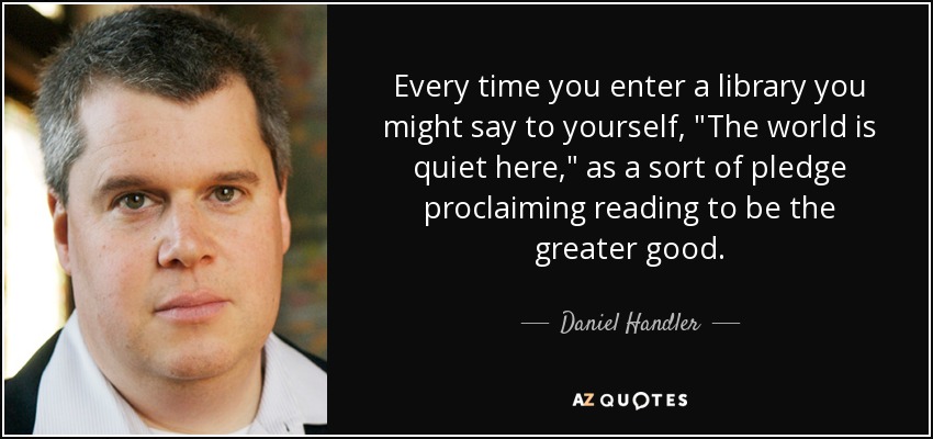 If you feel . . . that well-read people are less likely to be evil, and a world full of people sitting quietly with good books in their hands is preferable to world filled with schisms and sirens and other noisy and troublesome things, then every time you enter a library you might say to yourself, 'The world is quiet here,' as a sort of pledge proclaiming reading to be the greater good.
