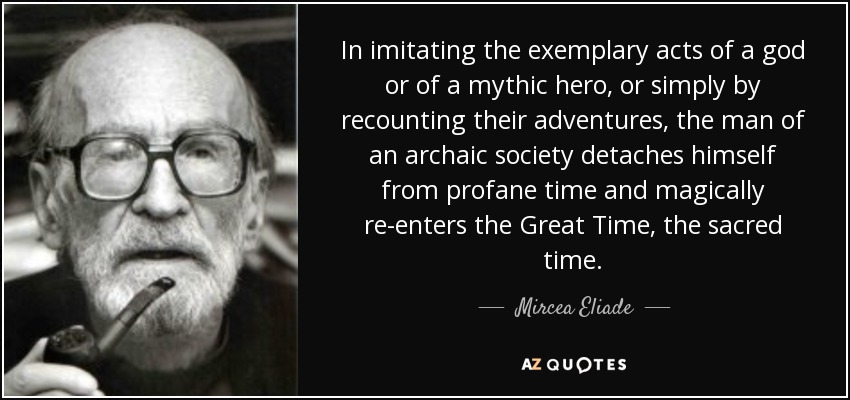 In imitating the exemplary acts of a god or of a mythic hero, or simply by recounting their adventures, the man of an archaic society detaches himself from profane time and magically re-enters the Great Time, the sacred time.