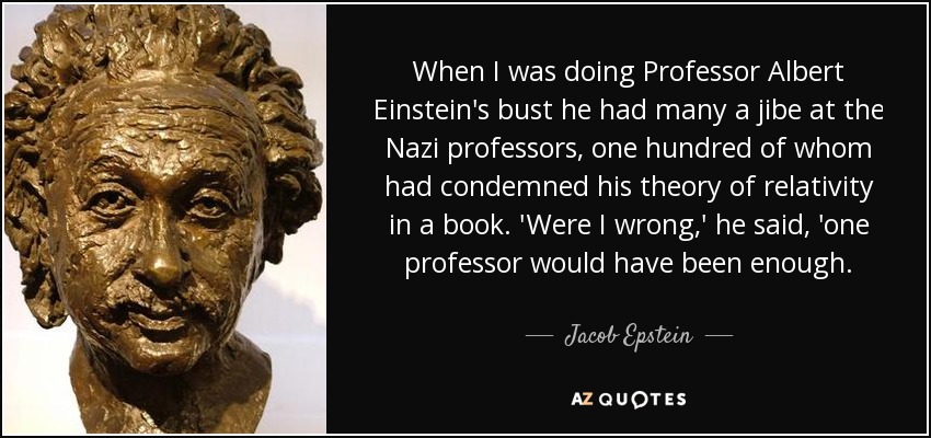 When I was doing Professor Albert Einstein's bust he had many a jibe at the Nazi professors, one hundred of whom had condemned his theory of relativity in a book. 'Were I wrong,' he said, 'one professor would have been enough.
