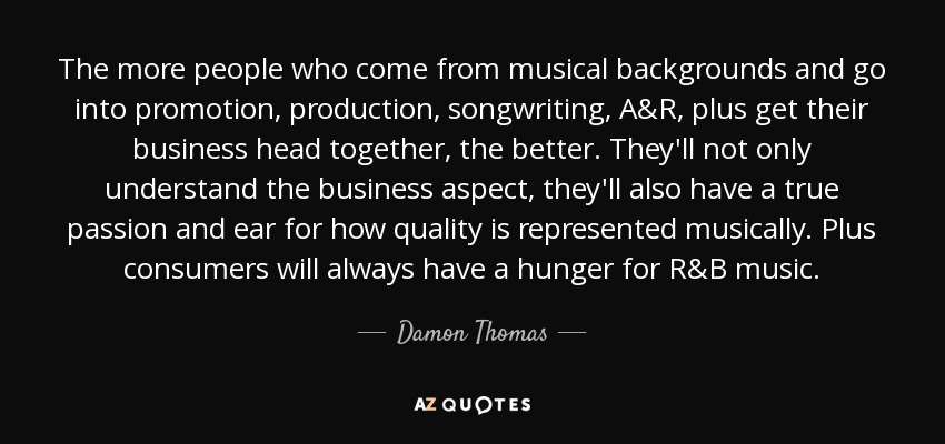 The more people who come from musical backgrounds and go into promotion, production, songwriting, A&R, plus get their business head together, the better. They'll not only understand the business aspect, they'll also have a true passion and ear for how quality is represented musically. Plus consumers will always have a hunger for R&B music.