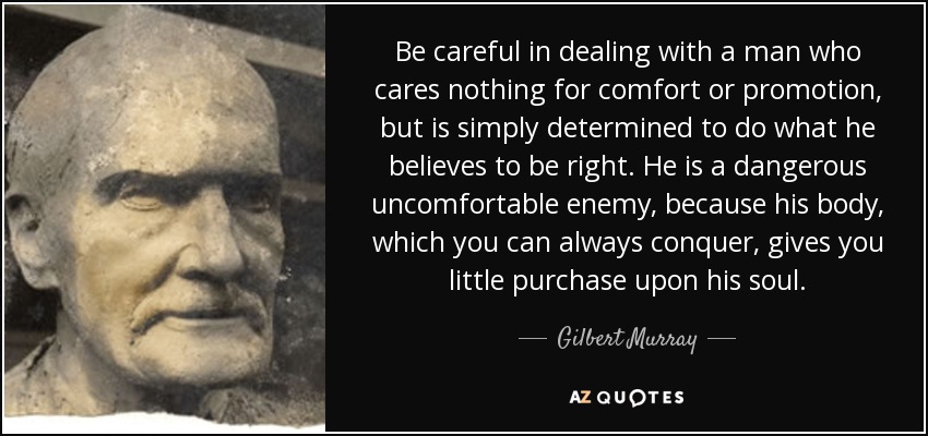 Be careful in dealing with a man who cares nothing for comfort or promotion, but is simply determined to do what he believes to be right. He is a dangerous uncomfortable enemy, because his body, which you can always conquer, gives you little purchase upon his soul.