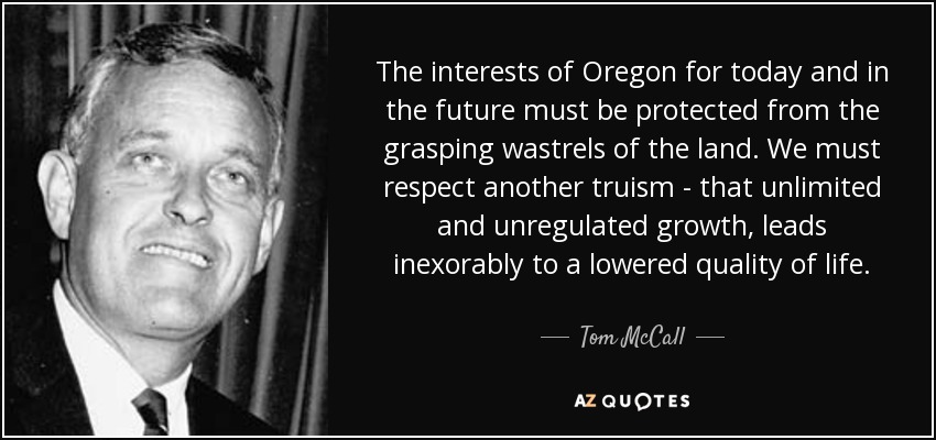 The interests of Oregon for today and in the future must be protected from the grasping wastrels of the land. We must respect another truism - that unlimited and unregulated growth, leads inexorably to a lowered quality of life.
