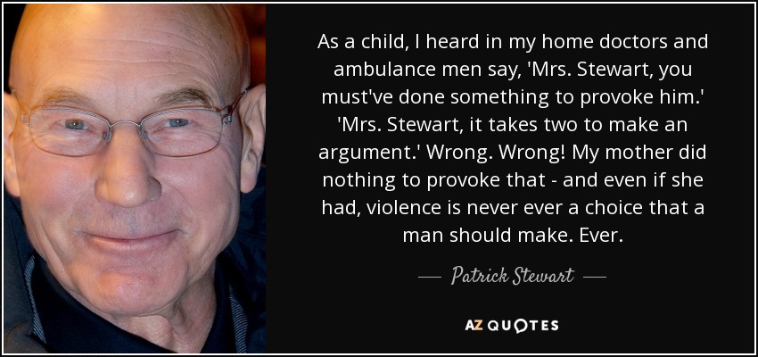 As a child, I heard in my home doctors and ambulance men say, 'Mrs. Stewart, you must've done something to provoke him.' 'Mrs. Stewart, it takes two to make an argument.' Wrong. Wrong! My mother did nothing to provoke that - and even if she had, violence is never ever a choice that a man should make. Ever.