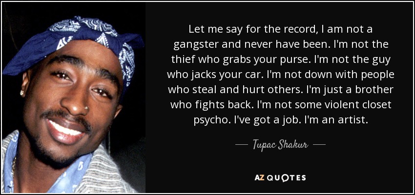 Let me say for the record, I am not a gangster and never have been. I'm not the thief who grabs your purse. I'm not the guy who jacks your car. I'm not down with people who steal and hurt others. I'm just a brother who fights back. I'm not some violent closet psycho. I've got a job. I'm an artist.