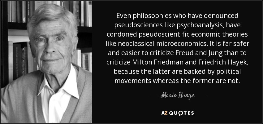 Even philosophies who have denounced pseudosciences like psychoanalysis, have condoned pseudoscientific economic theories like neoclassical microeconomics. It is far safer and easier to criticize Freud and Jung than to criticize Milton Friedman and Friedrich Hayek, because the latter are backed by political movements whereas the former are not.