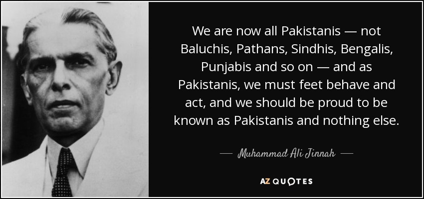 We are now all Pakistanis — not Baluchis, Pathans, Sindhis, Bengalis, Punjabis and so on — and as Pakistanis, we must feet behave and act, and we should be proud to be known as Pakistanis and nothing else.