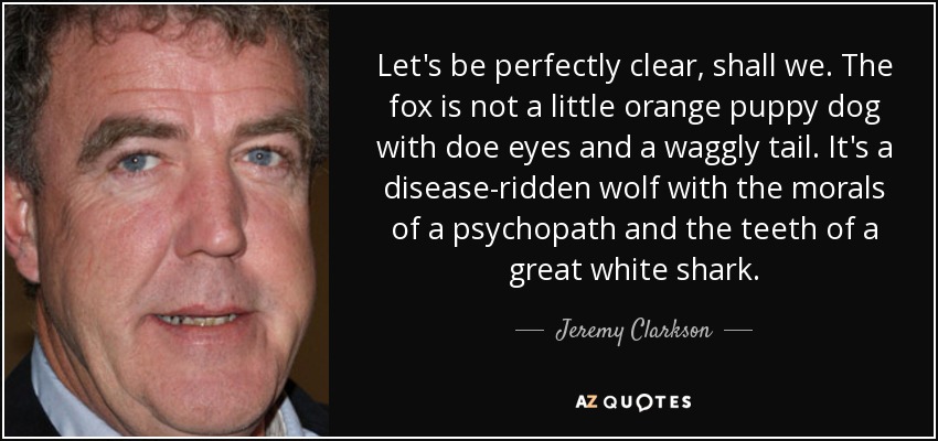 Let's be perfectly clear, shall we. The fox is not a little orange puppy dog with doe eyes and a waggly tail. It's a disease-ridden wolf with the morals of a psychopath and the teeth of a great white shark.