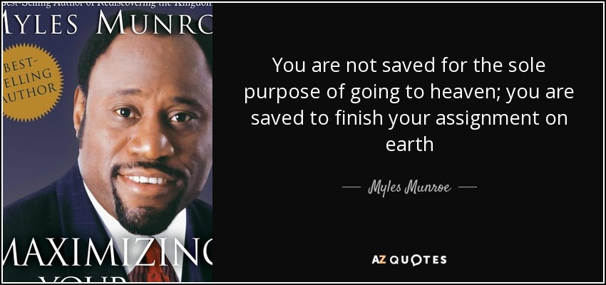You are not saved for the sole purpose of going to heaven; you are saved to finish your assignment on earth