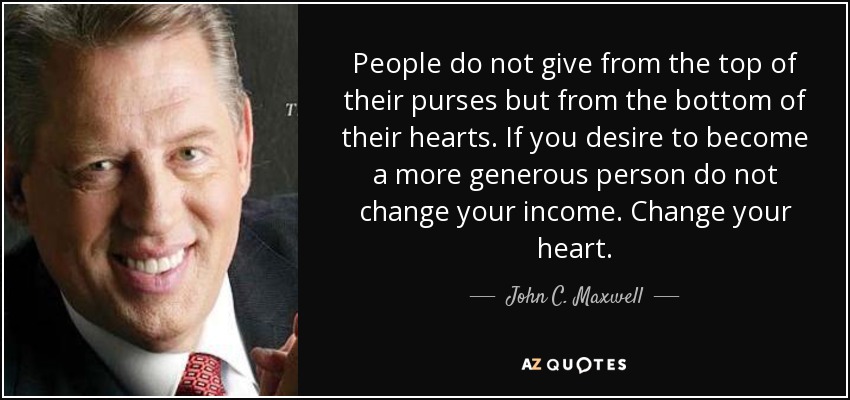 People do not give from the top of their purses but from the bottom of their hearts. If you desire to become a more generous person do not change your income. Change your heart.