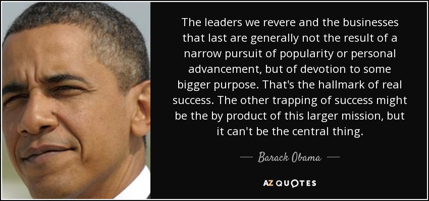 The leaders we revere and the businesses that last are generally not the result of a narrow pursuit of popularity or personal advancement, but of devotion to some bigger purpose. That's the hallmark of real success. The other trapping of success might be the by product of this larger mission, but it can't be the central thing.