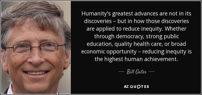 Humanity’s greatest advances are not in its discoveries – but in how those discoveries are applied to reduce inequity. Whether through democracy, strong public education, quality health care, or broad economic opportunity – reducing inequity is the highest human achievement.