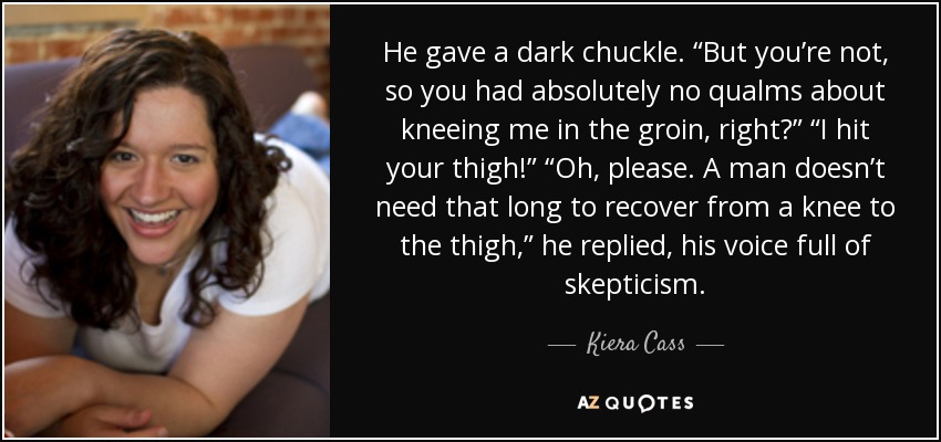 He gave a dark chuckle. “But you’re not, so you had absolutely no qualms about kneeing me in the groin, right?” “I hit your thigh!” “Oh, please. A man doesn’t need that long to recover from a knee to the thigh,” he replied, his voice full of skepticism.