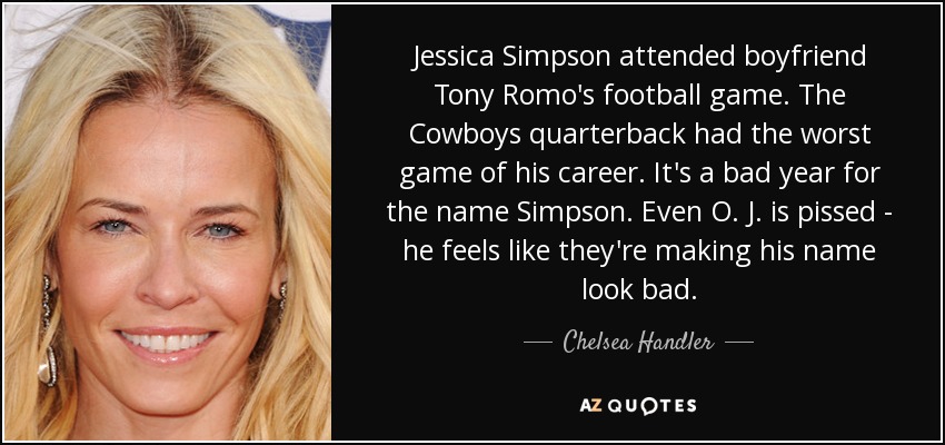 Jessica Simpson attended boyfriend Tony Romo's football game. The Cowboys quarterback had the worst game of his career. It's a bad year for the name Simpson. Even O. J. is pissed - he feels like they're making his name look bad.