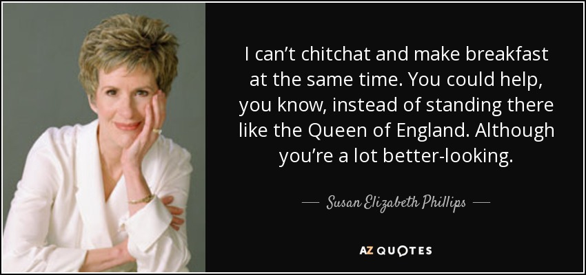 I can’t chitchat and make breakfast at the same time. You could help, you know, instead of standing there like the Queen of England. Although you’re a lot better-looking.