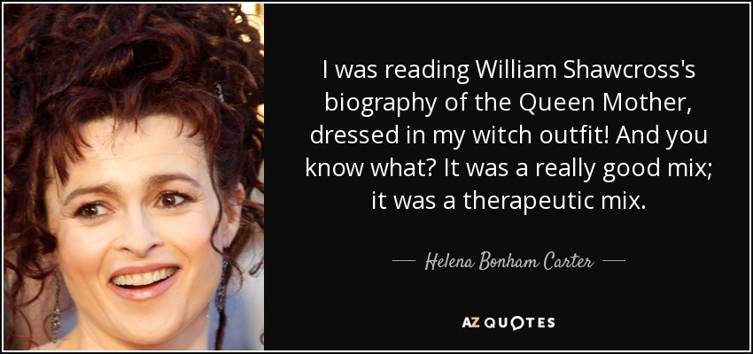 I was reading William Shawcross's biography of the Queen Mother, dressed in my witch outfit! And you know what? It was a really good mix; it was a therapeutic mix.