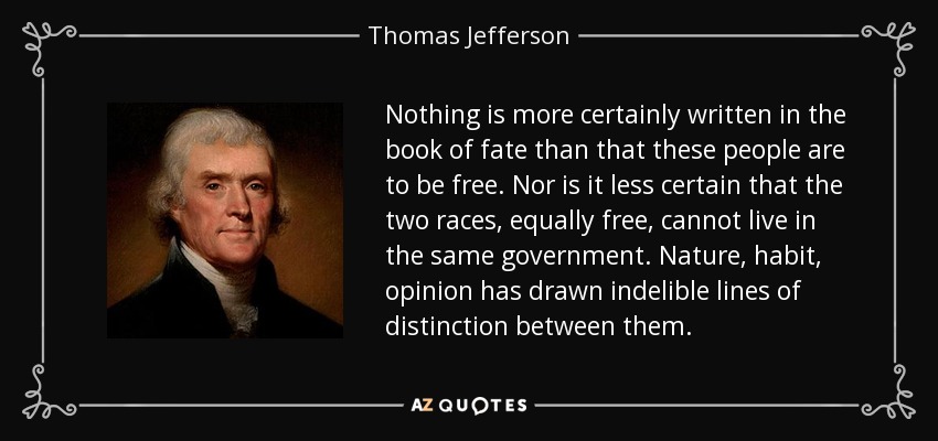 Nothing is more certainly written in the book of fate than that these people are to be free. Nor is it less certain that the two races, equally free, cannot live in the same government. Nature, habit, opinion has drawn indelible lines of distinction between them.