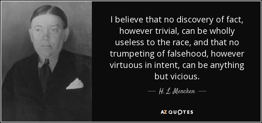 I believe that no discovery of fact, however trivial, can be wholly useless to the race, and that no trumpeting of falsehood, however virtuous in intent, can be anything but vicious.