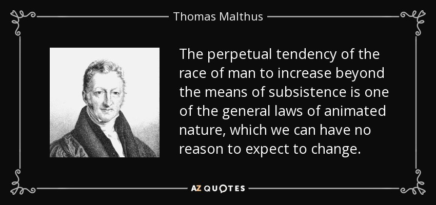 Thomas Robert Malthus (1798). “An Essay on the Principle of Population, as it Affects the Future Imporvement of Society, with Remarks on the Speculations of Mr. Godwin, M. Condorcet, and Other Writers”, p.346, The Lawbook Exchange, Ltd.