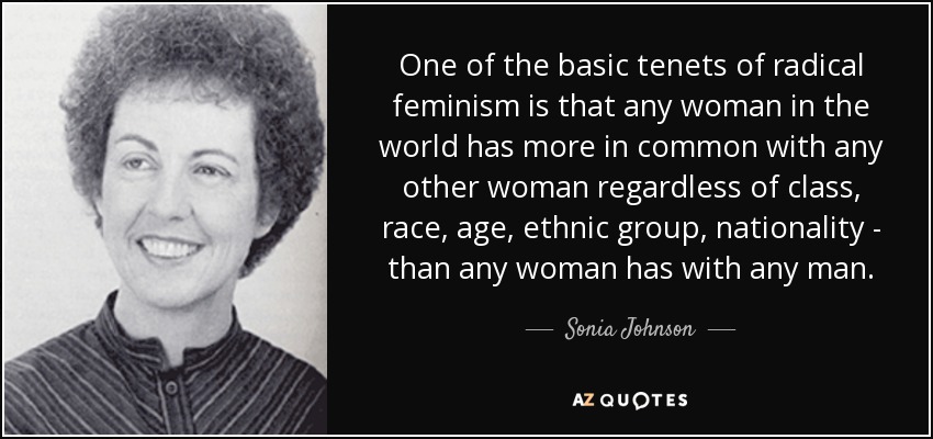 One of the basic tenets of radical feminism is that any woman in the world has more in common with any other woman regardless of class, race, age, ethnic group, nationality - than any woman has with any man.