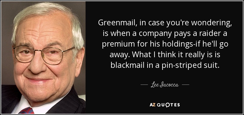 Greenmail, in case you're wondering, is when a company pays a raider a premium for his holdings-if he'll go away. What I think it really is is blackmail in a pin-striped suit.