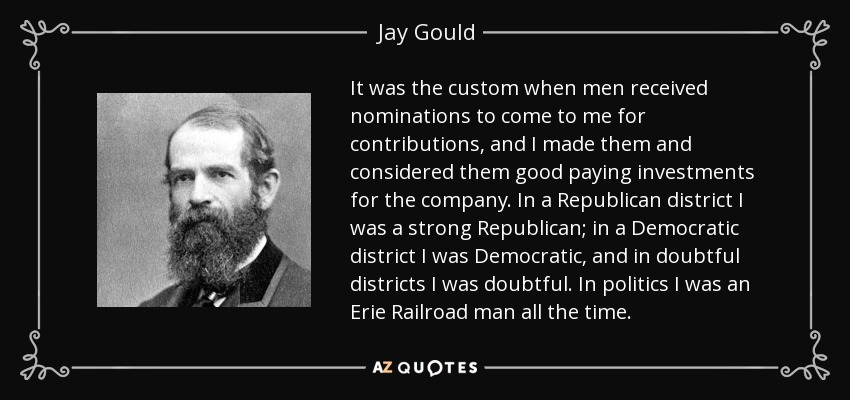 It was the custom when men received nominations to come to me for contributions, and I made them and considered them good paying investments for the company. In a Republican district I was a strong Republican; in a Democratic district I was Democratic, and in doubtful districts I was doubtful. In politics I was an Erie Railroad man all the time.
