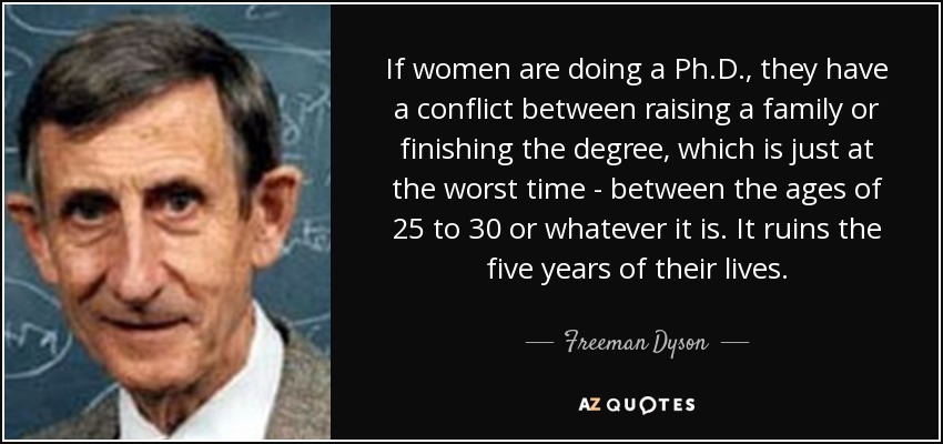 If women are doing a Ph.D., they have a conflict between raising a family or finishing the degree, which is just at the worst time - between the ages of 25 to 30 or whatever it is. It ruins the five years of their lives.