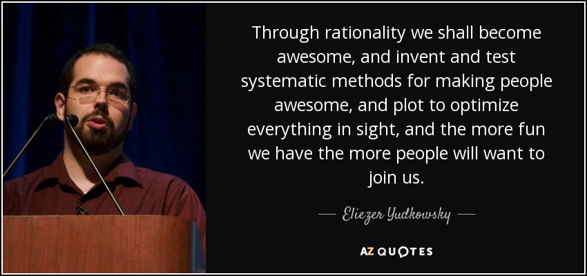 Through rationality we shall become awesome, and invent and test systematic methods for making people awesome, and plot to optimize everything in sight, and the more fun we have the more people will want to join us.