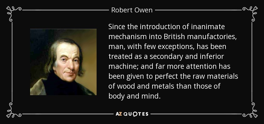 Since the introduction of inanimate mechanism into British manufactories, man, with few exceptions, has been treated as a secondary and inferior machine; and far more attention has been given to perfect the raw materials of wood and metals than those of body and mind.
