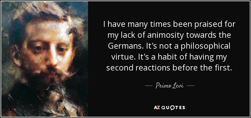 I have many times been praised for my lack of animosity towards the Germans. It's not a philosophical virtue. It's a habit of having my second reactions before the first.