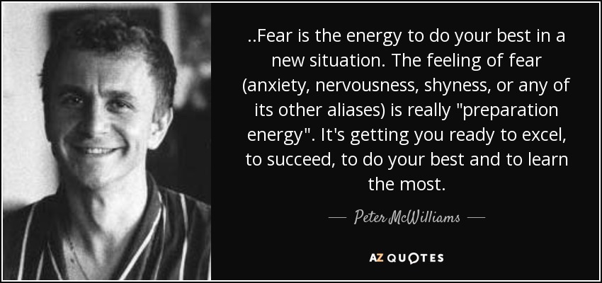 ..Fear is the energy to do your best in a new situation. The feeling of fear (anxiety, nervousness, shyness, or any of its other aliases) is really "preparation energy". It's getting you ready to excel, to succeed, to do your best and to learn the most.