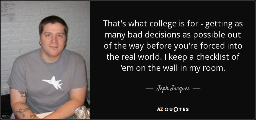 That's what college is for - getting as many bad decisions as possible out of the way before you're forced into the real world. I keep a checklist of 'em on the wall in my room.