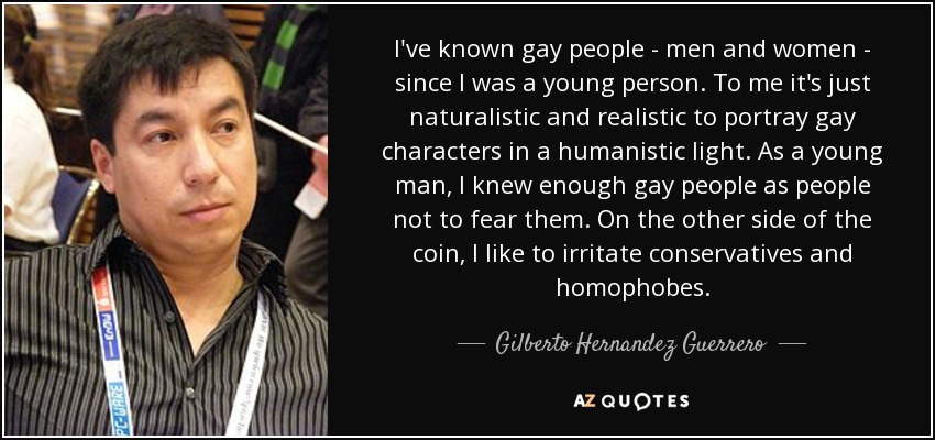I've known gay people - men and women - since I was a young person. To me it's just naturalistic and realistic to portray gay characters in a humanistic light. As a young man, I knew enough gay people as people not to fear them. On the other side of the coin, I like to irritate conservatives and homophobes.