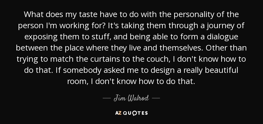 What does my taste have to do with the personality of the person I'm working for? It's taking them through a journey of exposing them to stuff, and being able to form a dialogue between the place where they live and themselves. Other than trying to match the curtains to the couch, I don't know how to do that. If somebody asked me to design a really beautiful room, I don't know how to do that.