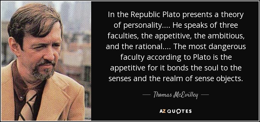In the Republic Plato presents a theory of personality. ... He speaks of three faculties, the appetitive, the ambitious, and the rational. ... The most dangerous faculty according to Plato is the appetitive for it bonds the soul to the senses and the realm of sense objects.
