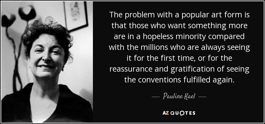 The problem with a popular art form is that those who want something more are in a hopeless minority compared with the millions who are always seeing it for the first time, or for the reassurance and gratification of seeing the conventions fulfilled again.