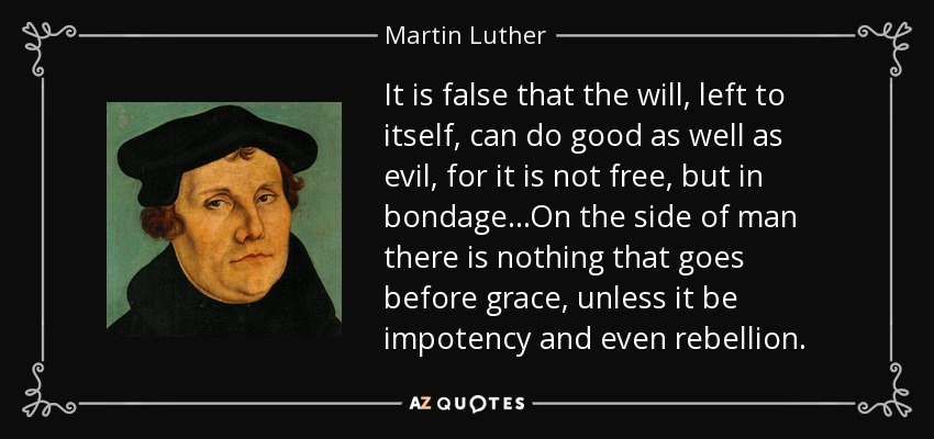 It is false that the will, left to itself, can do good as well as evil, for it is not free, but in bondage...On the side of man there is nothing that goes before grace, unless it be impotency and even rebellion.