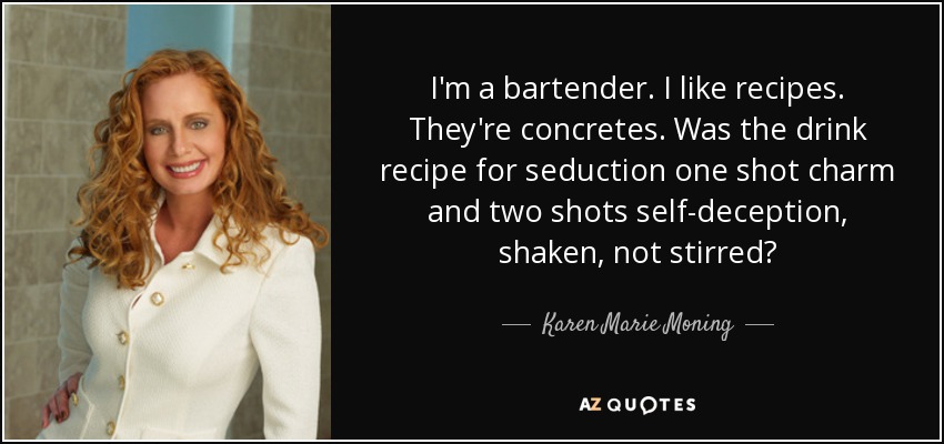 I'm a bartender. I like recipes. They're concretes. Was the drink recipe for seduction one shot charm and two shots self-deception, shaken, not stirred?
