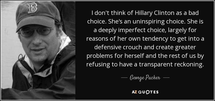 I don't think of Hillary Clinton as a bad choice. She's an uninspiring choice. She is a deeply imperfect choice, largely for reasons of her own tendency to get into a defensive crouch and create greater problems for herself and the rest of us by refusing to have a transparent reckoning.