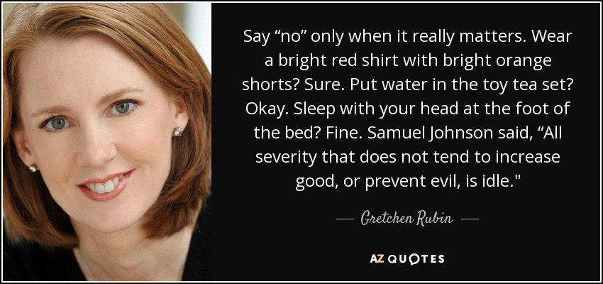 Say “no” only when it really matters. Wear a bright red shirt with bright orange shorts? Sure. Put water in the toy tea set? Okay. Sleep with your head at the foot of the bed? Fine. Samuel Johnson said, “All severity that does not tend to increase good, or prevent evil, is idle."
