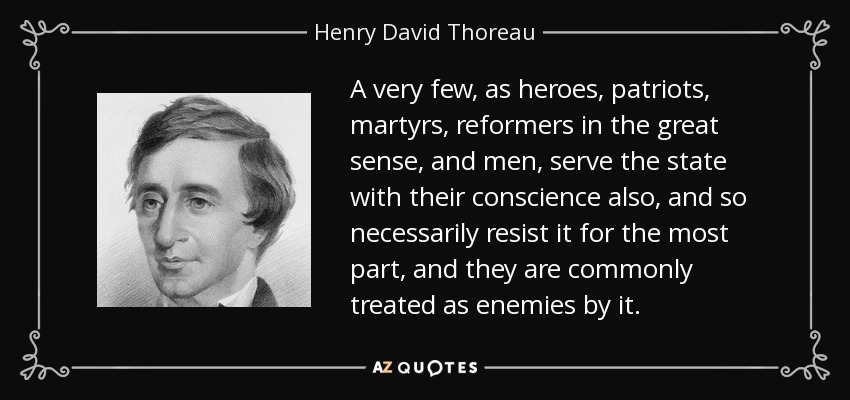 Others - as most legislators, politicians, lawyers, ministers, and office-holders - serve the state chiefly with their heads; and, as they rarely make any moral distinctions, they are as likely to serve the devil, without intending it, as God. A very few - as heroes, patriots, martyrs, reformers in the great sense, and men - serve the state with their consciences also, and so necessarily resist it for the most part.