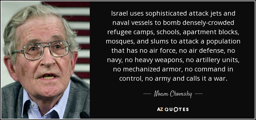 Israel uses sophisticated attack jets and naval vessels to bomb densely-crowded refugee camps, schools, apartment blocks, mosques, and slums to attack a population that has no air force, no air defense, no navy, no heavy weapons, no artillery units, no mechanized armor, no command in control, no army and calls it a war.