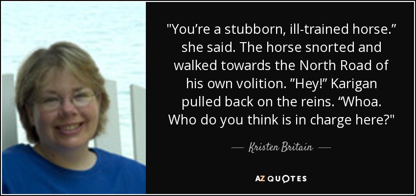 "You’re a stubborn, ill-trained horse.” she said. The horse snorted and walked towards the North Road of his own volition. ”Hey!” Karigan pulled back on the reins. “Whoa. Who do you think is in charge here?"