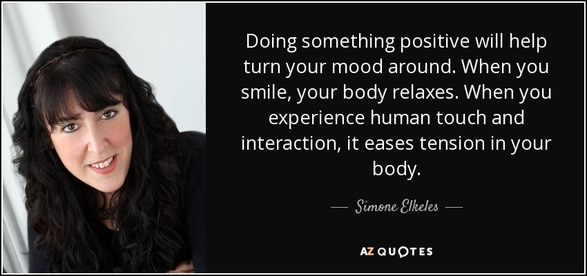 Doing something positive will help turn your mood around. When you smile, your body relaxes. When you experience human touch and interaction, it eases tension in your body.