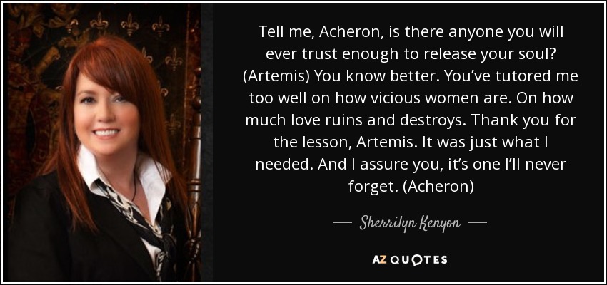 Tell me, Acheron, is there anyone you will ever trust enough to release your soul? (Artemis) You know better. You’ve tutored me too well on how vicious women are. On how much love ruins and destroys. Thank you for the lesson, Artemis. It was just what I needed. And I assure you, it’s one I’ll never forget. (Acheron)
