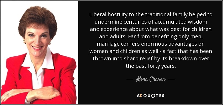 Liberal hostility to the traditional family helped to undermine centuries of accumulated wisdom and experience about what was best for children and adults. Far from benefiting only men, marriage confers enormous advantages on women and children as well - a fact that has been thrown into sharp relief by its breakdown over the past forty years.